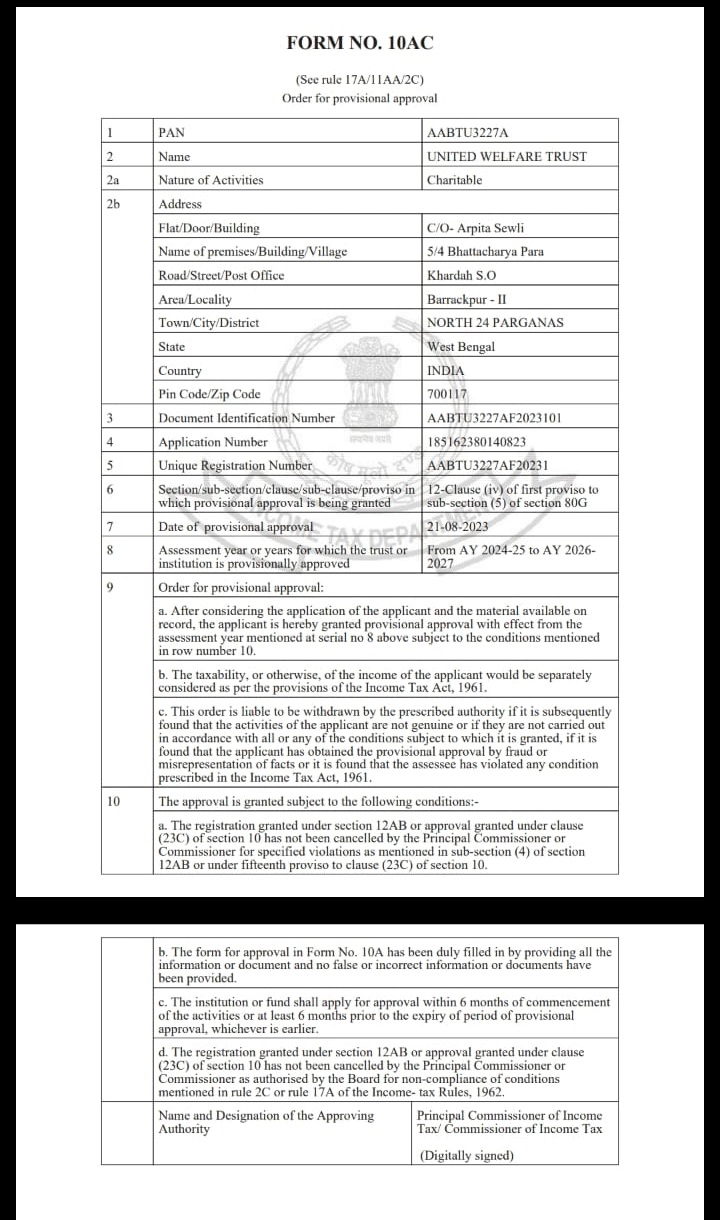 Documents Gallery United Welfare Trust REGISTRATION CERTIFICATE 12A CERTIFICATE 80G CERTIFICATE ORGANISATION PAN